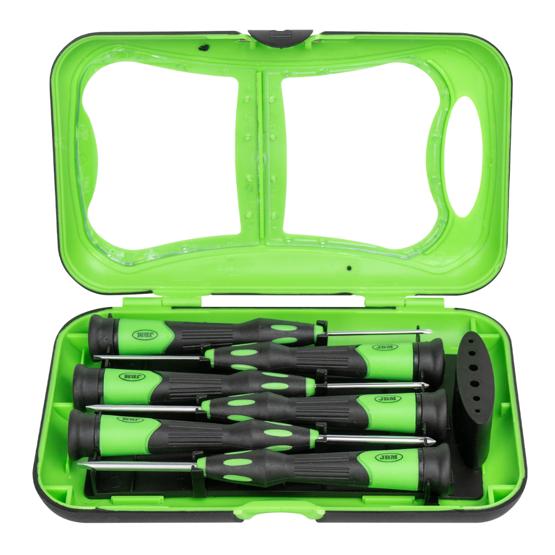 Set di cacciaviti di precisione targati JBM, azienda specialista nella distribuzione di utensili e attrezzature automobilistiche.